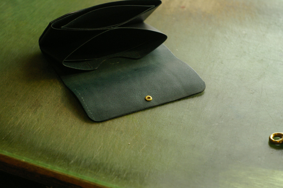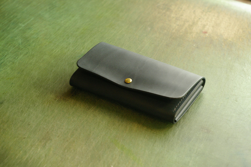 手染めモスグリーンの長財布です。 小さ目な真鍮ホックで留める装飾の少ない型でご依頼頂きました。 ありがとうございました。