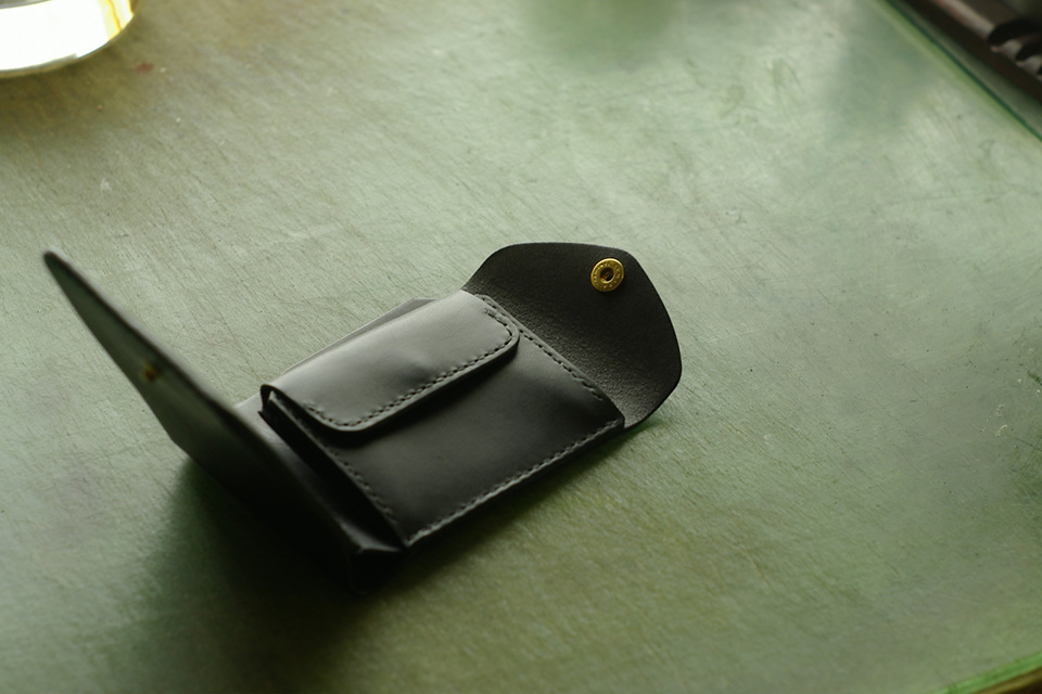 定番のフラップ付き二つ折り財布。 革の色や糸の色の組み合わせで印象がガラッと変わります。